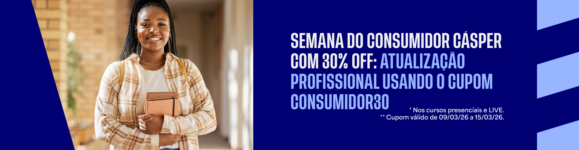 O desconto de 10% para alunos e ex-alunos é válido para todos os alunos e ex-alunos da graduação, pós-graduação e mestrado da Faculdade Cásper Líbero. Para obtê-lo basta utilizar o cupom ALUNO10 no campo de cupons no ato do pagamento. Se por algum motivo seu desconto não seja aplicado não se preocupe, basta entrar em contato nos informando que viabilizaremos seu desconto da melhor forma possível.